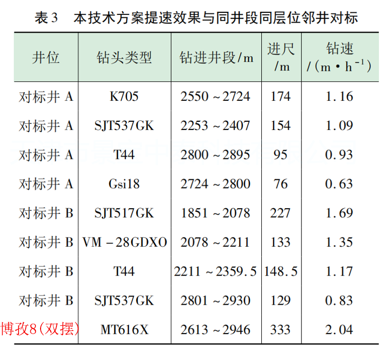 采用双摆Ⅰ型提速钻具单只钻头进尺333m,平均机械钻速2.04m/h。相较于邻井 A 同井段同层位钻头平均进尺提高 175%,平均机械钻速提高 110%;相较于邻井 B 同井段同层位钻头平均进尺提高 142%,平均机械钻速提高 88%。 |