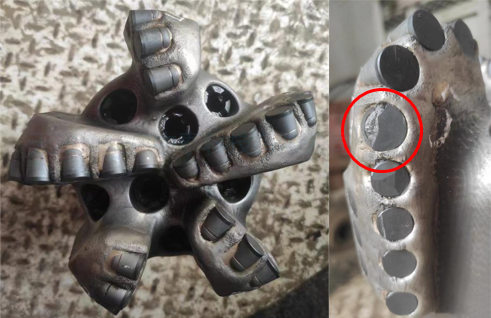 本趟钻地层是黄山街组和克拉玛依组,以深灰色泥岩、灰黑色碳质泥岩、灰色荧光泥质粉砂岩为主,高密度的地层塑性强。使用江汉五刀翼PDC钻头(型号KS1652RTX),进尺276m,出井新度95%,钻头外观完整,保径部分有一颗崩齿。