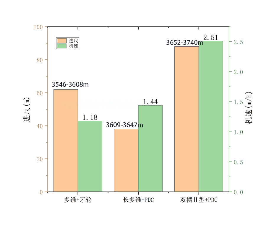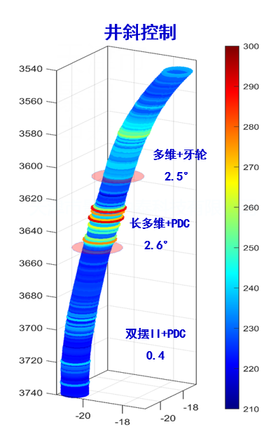 双摆Ⅱ型提速工具+钟摆钻具组合在钻进中,施工井段3651-3900m,井斜从2.6°降至0.4°,充分说明该工具在辅助纠偏能力上的优势明显,并提高了井身质量。