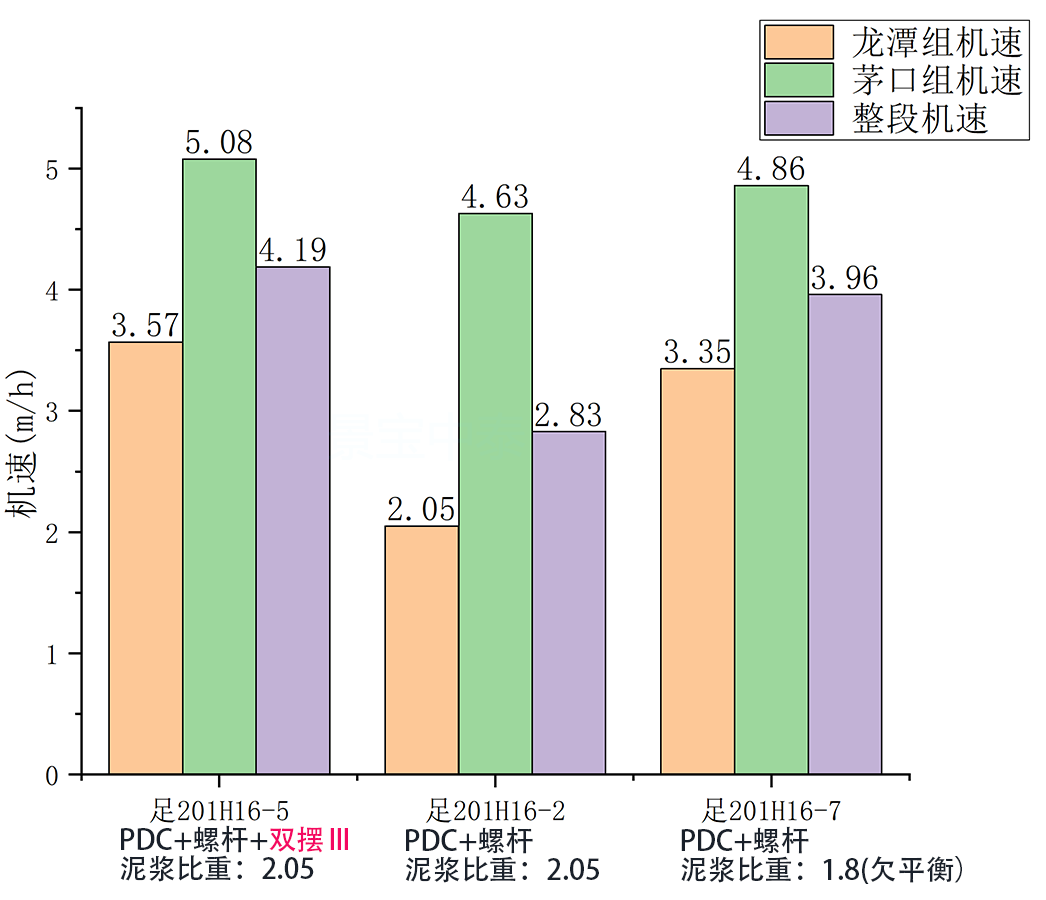 采用双摆Ⅲ型提速工具对比足201H16-2井在龙潭组和茅口组平均机速分别提高